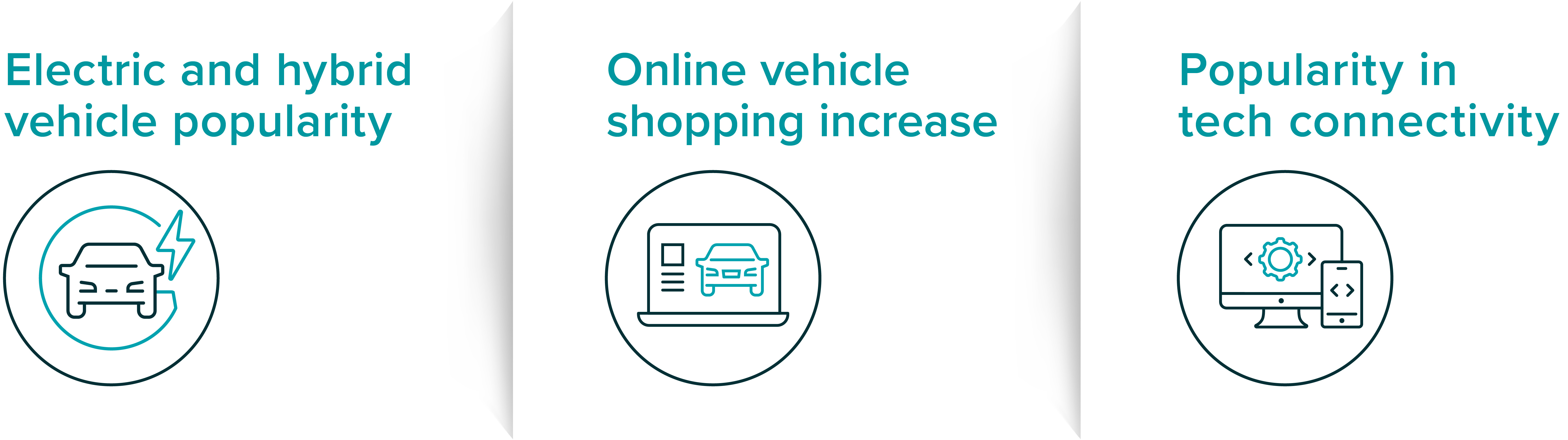 - Rise of online vehicle shopping: Over the past few years, people have embraced online shopping on an entirely new level. Online car shopping has become especially popular, and dealerships have responded by implementing more features and services that support it.